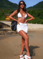 Modelagem que desenha o corpo e com amarração na parte da frente que pode brincar com a altura (deixando ela uma saia maior ou menor.)